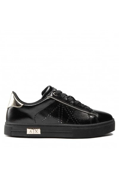 Boven in zwart lakleer met gouden inzetstukken. Zijlogo met gaten en gouden hiel. Zwart rubberen zool met gouden metalen logo. Normale pasvorm. Armani Exchange Brand