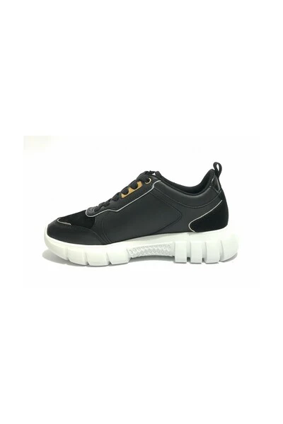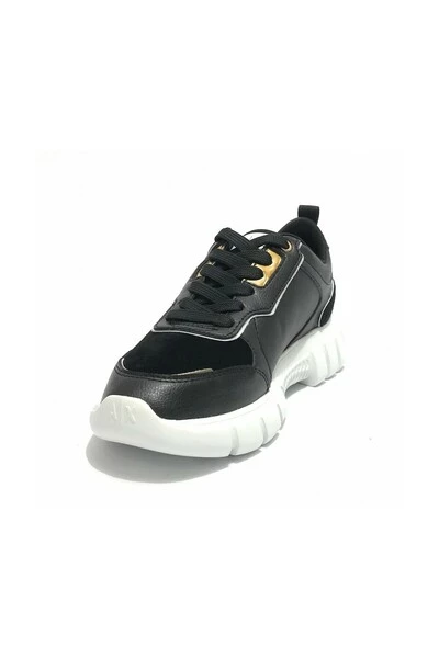 Armani Exchange Schoenen Zwart Running Sneaker Running. Gemaakt van eco-leer, met zwart-suède inserts. Zwarte veters. Zwart laminaat inzet op hiel en gelamineerd goud bovenaan. Interieur gevoerd in stof. Rubber draaiende type achtergrond. Hak: 4,0 cm. Plateau: 2,5 cm. Gewoon fit. Origineel product