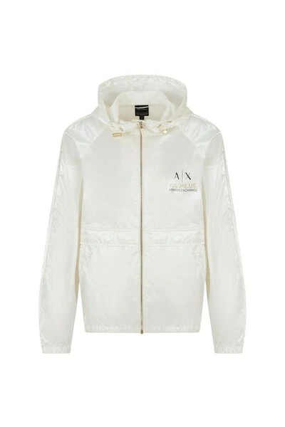 Armani Exchange Technical Fabric Tissue, FW 22-23 Collection, Beige Color With Contrast Logo aan de voorkant, nek met capuchon en elastische aanpassing, hoofdafsluiting met rits, twee voorzijdezakken. 100% polyamidesamenstelling.